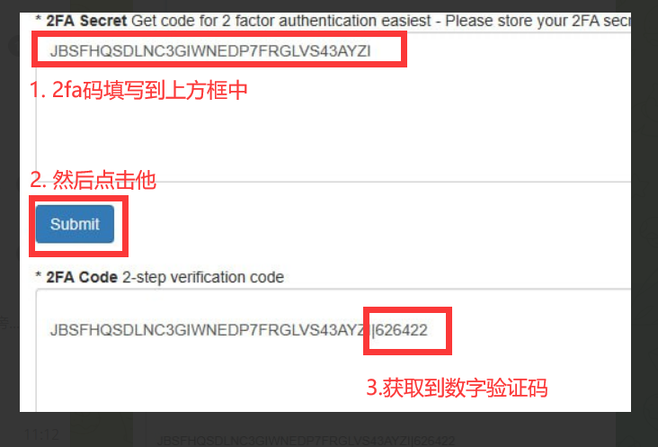 上方输入 2FA密钥 点击submit 下方末尾6位数字就是 验证码